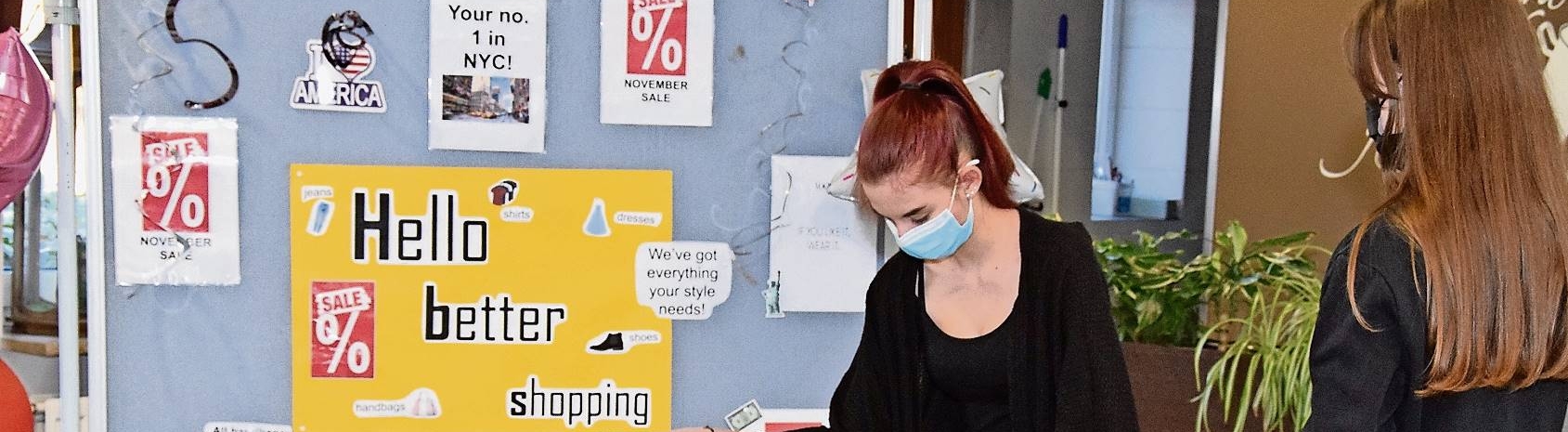 Klamotten einkaufen auf Englisch: Eine von verschiedenen Aufgaben, denen sich die Achtklässler an den Stationen in der Mensa stellten.Hilken Die Mensa war gestern Nachmittag kaum wiederzuerkennen. An sechs Stationen waren verschiedene Lokalitäten aufgebaut, die sich in New York befinden könnten und an denen sich jeweils zwei Schüler als Partner in Form von möglichst authentischen Rollenspielen sprachlich austoben sollten.